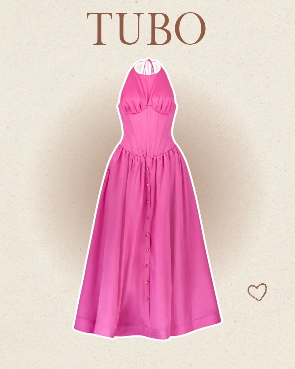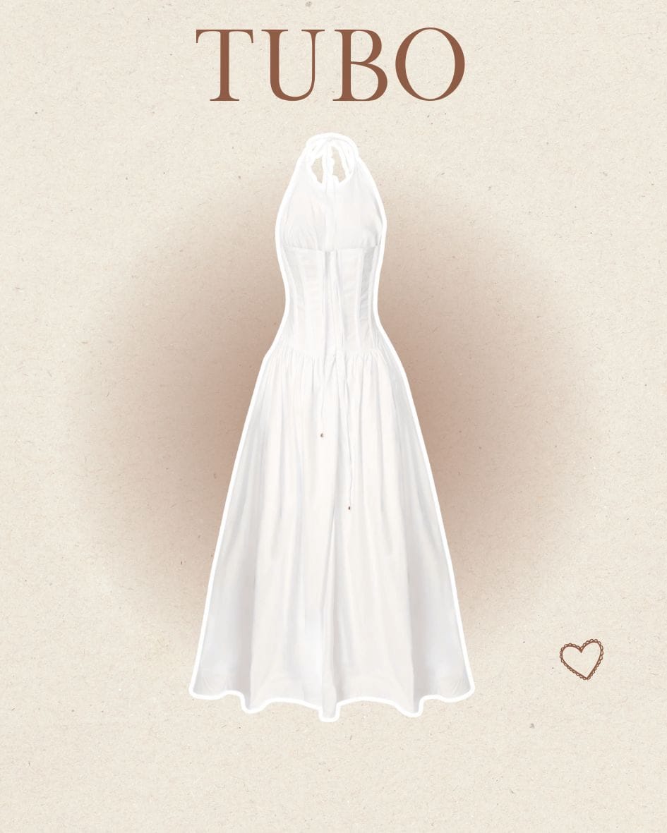 The Geisha Dress, now with luxe lining and custom buttons for that elevated finish. Sculpted bodice, signature halter neckline, and yes — she still turns heads.
